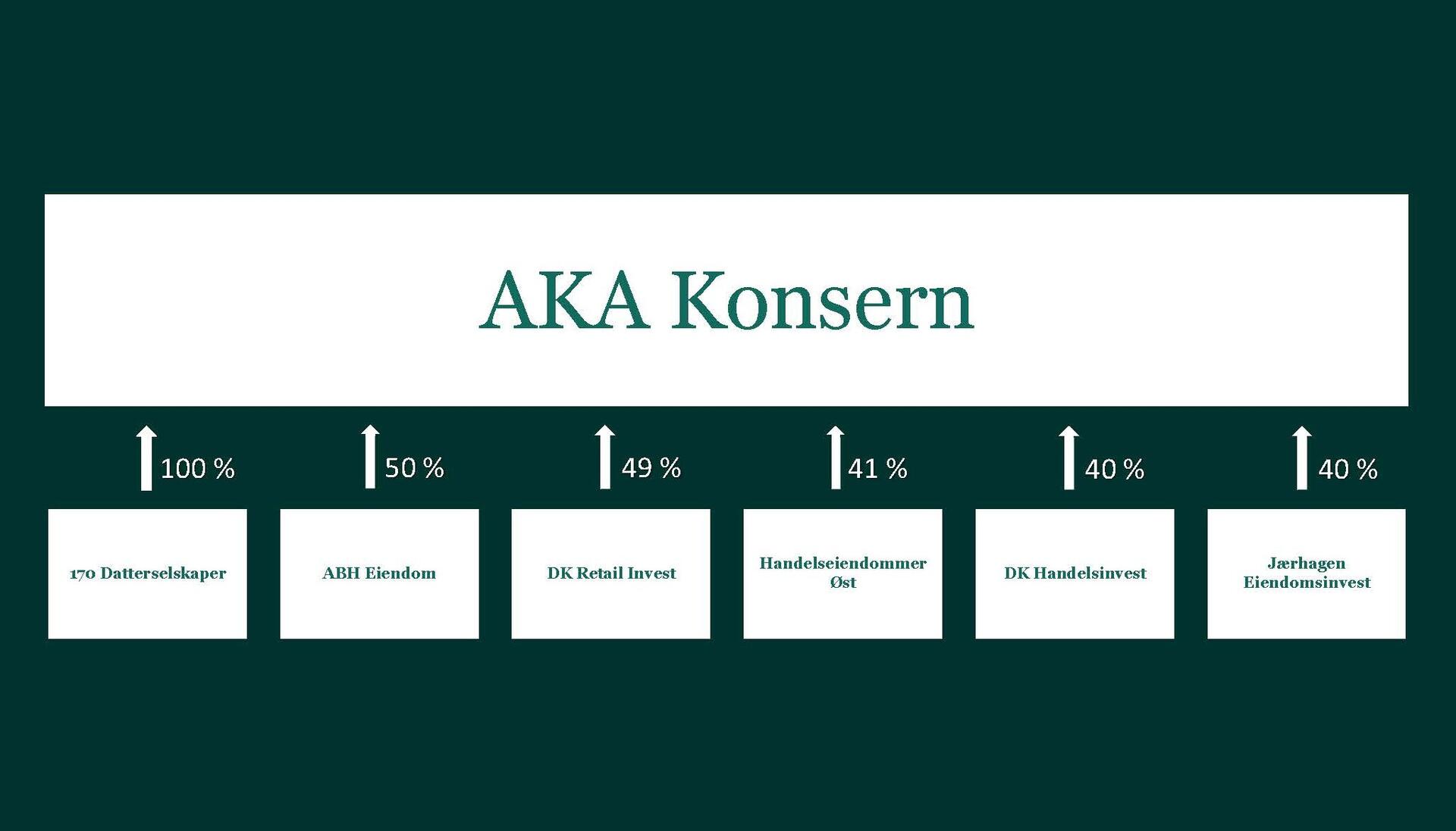 | Selskap/ Konsern | Antall eiendommer | Årlig leie i MNOK | Totalareal i m² | Utleid areal i % | Eierandel AKA | Andel årsleie | Andel areal |